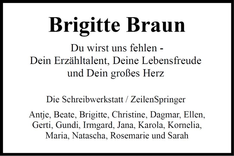 Es gibt Menschen die einem im Leben immer in Erinnerung bleiben. Frau Braun hat als Klassenlehrerin meine Schulzeit geprägt und viele positive Spuren hinterlassen. Möge sie gut auf der anderen Seite des Regenbogens angekommen sein!