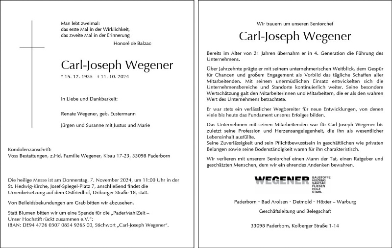 Als ehemaliger Mitarbeiter bleibt mir Carl Joseph mit seiner Pfeife und seinem BMW unvergessen. Er hat das Unternehmensbild des Baustoffhandels im Paderborner Land uber Jahrzehnte gepragt. Selbst in Warburg,Arolsen und Detmold war seine Firma bekannt. Der Helmut Steinkemper,Georg Haus, Willi Michaelis und ich sind viele Kilometer gefahren um seine Baustoffe an ihr Ziel zu bringen. Wir sind inzwischen im Ruhestand und Carl Joseph hat das ewige Leben erreicht.