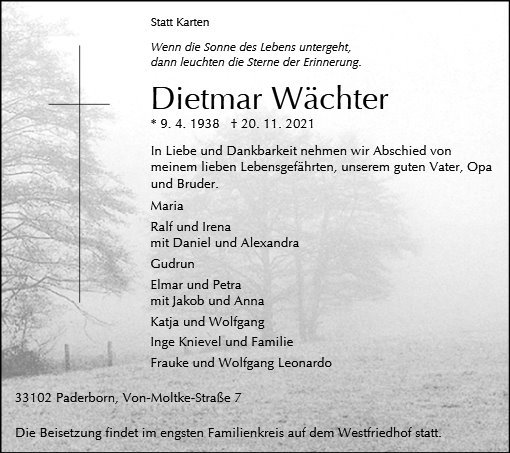 Lieber Dietmar, in Erinnerung bleibt mir dein offenes Haus, wo jeder jederzeit willkommen war, mit Herzlichkeit vorbehaltlos aufgenommen wurde. Beeindruckt hat mich sehr und tut es immer noch, wie du dein Lebensmotto trotz vieler Prüfungen des Schicksals, bis zum Schluß ausgelebt hast: