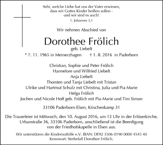 Liebe Familie Frölich, wir haben uns erst im Krankenhaus kennen gelernt , Dorothee war die beste Bettnachbarin meiner Frau , die ebenfalls an Krebs erkrankt ist! Fast 2 Wochen haben wir miteinander verbracht und diese Zeit hat uns soviel Kraft gegeben! Sie war so ein besonderer Mensch und wir sind sehr dankbar sie kennen gelernt zu haben. Wir wünschen eurer Familie viel Kraft und wissen , dass Dorothee gut in Gottes Hand geborgen ist , ihr Glaube hat uns stark beeindruckt! Alles Liebe für euch! Birgit und Ingrid
