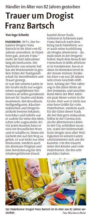 wir sind immer sehr gerne in Ihr Geschäft gekommen. Ob Ihre rußfreien Kerzen oder auch Krippenfiguren, haben wir immer sehr gern bei Ihnen gekauft. Wir werden Sie und die netten Unterhaltungen mit Ihnen sehr vermissen.
