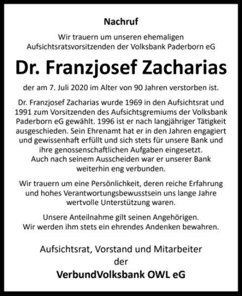 Dr. Franzjosef Zachariasgestorben am 7. Juli 2020