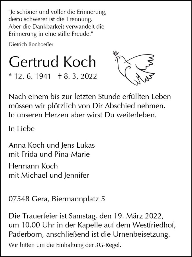 Liebe Anna und Familie, heute habe ich erfahren, dass Gertrud gestorben ist. Für mich unfassbar. Gertrud war für mich eine sehr wichtige Wegbegleiterin. Ihr Wesen, Ihren Mut, Ihr Einsatz für Frieden und Gerechtigkeit werden stets in meiner Erinnerung bleiben. Ich wünsche Ihnen viel Kraft und wünsche Ihnen, dass Ihnen die vielen schönen Erinnerungen mit Gertrud die Zeit des Trauerns erhellen. In tiefer Anteilnahme Claudia Apel