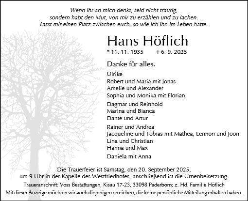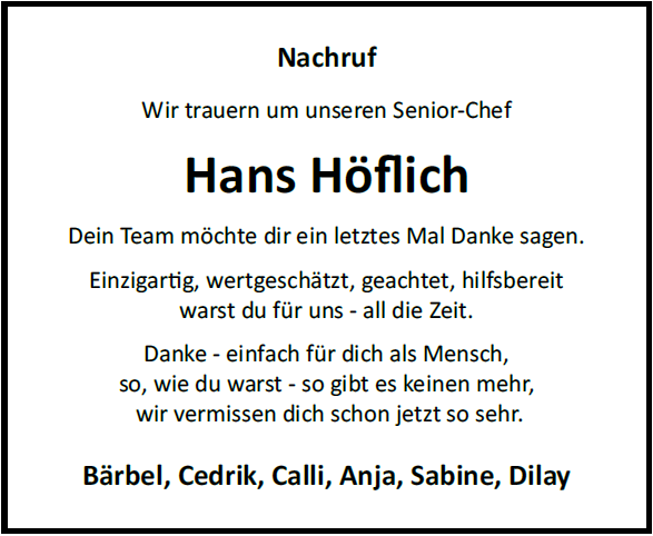 mit Bedauern und tief betroffen habe ich gestern vom Tode des lieben Hans erfahren und möchte Ihnen mein aufrichtiges Beileid aussprechen. Ich wünsche Ihnen in dieser schweren Zeit viel Kraft. Ich werde Hans als einen sehr liebenwürdigen und aufrichtigen Menschen in Erinnerung behalten.