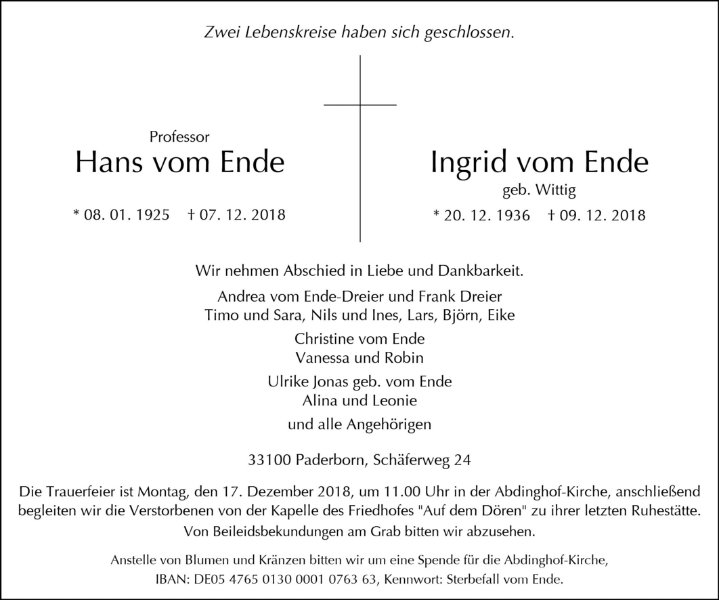 Prof. Hans vom Endegestorben am 7. Dezember 2018