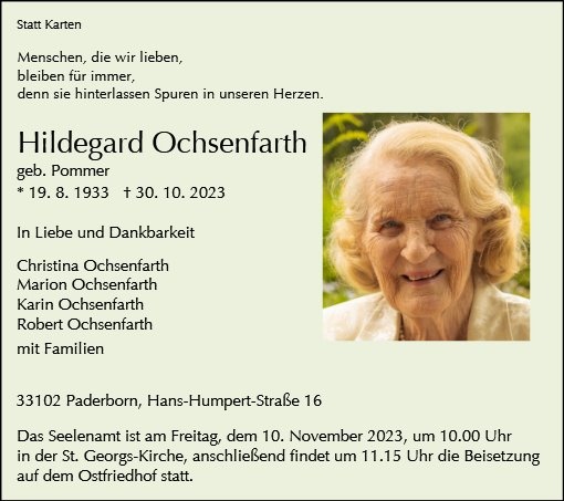 Ein kleiner Trost für Euch trotz allem über den Verlust ist vielleicht das Wissen, dass Eure Mutter, Oma und Uroma ein erfülltes Leben hatte und nun friedlich eingeschlafen ist.