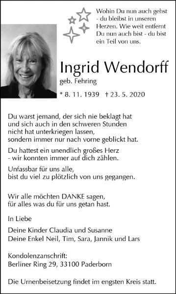 Ingrid Wendorffgestorben am 23. Mai 2020