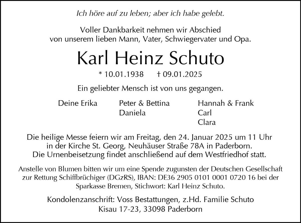 Karl Heinz Schutogestorben am 9. Januar 2025