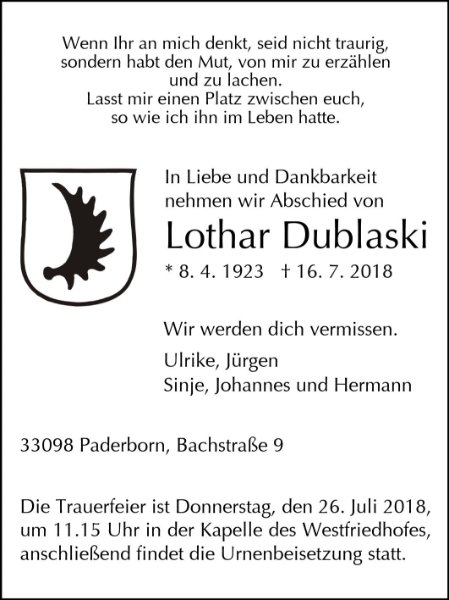 Lothar Dublaskigestorben am 16. Juli 2018