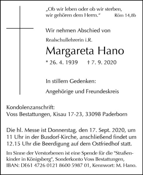 Margareta Hanogestorben am 7. September 2020