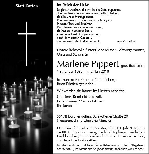 Mit dem Anzünden einer Kerze oder Mitteilen von Gedanken in ganz persönlichen Worten können Verwandte, Freunde oder Bekannte an Ihre liebe Verstorbene denken.