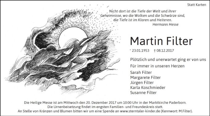 Gerne hätte ich weiter mit Dir zusammengearbeitet und mich in den freien Minuten mit Dir über Gott und die Welt unterhalten. Wir hatten immer ein Thema, das wir besprechen konnten und es hat mir immer sehr viel Spaß gemacht, mich mit Dir auszutauschen. Und, lieber Martin - die Leckereien auf unseren Eß-Tellern, die waren ja wohl Kult. Ich habe Deine Ruhe, Deine Ausgeglichenheit, Deine Souveränität sehr geschätzt, aber auch Deine Menschlichkeit. Martin, Du wirst mir richtig fehlen. Ich wünsche mir und glaube fest daran, daß Du nun von oben auf uns hinunterschaust und guckst, daß wir alles in Deinem Sinne weiterführen. Es bleibt eine große Traurigkeit, Martin. Aber ich bin auch froh, daß ich Dich kennenlernen durfte. Mach' et joot. Dein Kollege & Freund Bernd