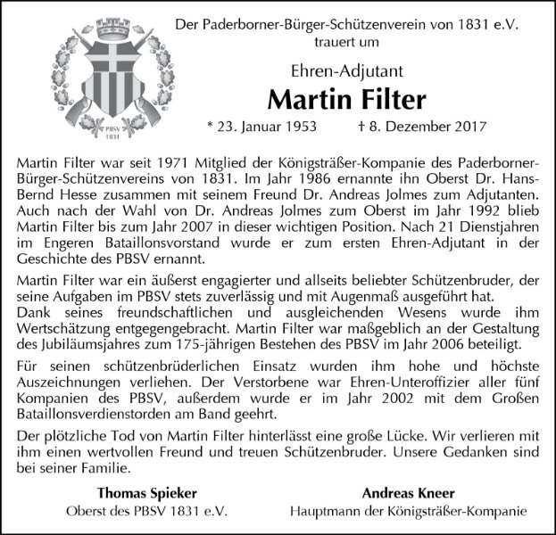 Dipl.-Kfm. Martin Filtergestorben am 8. Dezember 2017