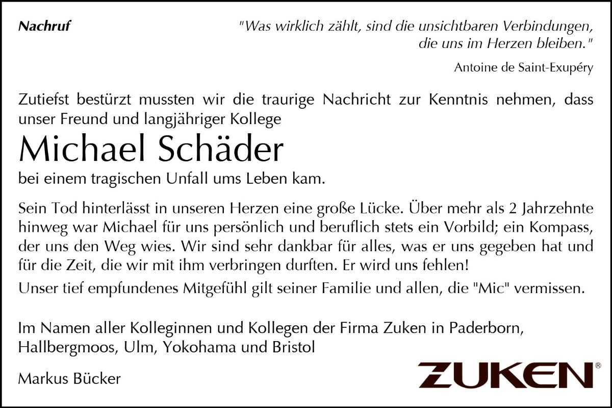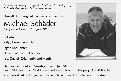 Der unerwartete Tod von Michael ist unwirklich und nicht zu verstehen. Wir sind mit unseren Gedanken häufig bei euch und wünschen euch Kraft, Trost und Zuversicht in dieser schweren Zeit.