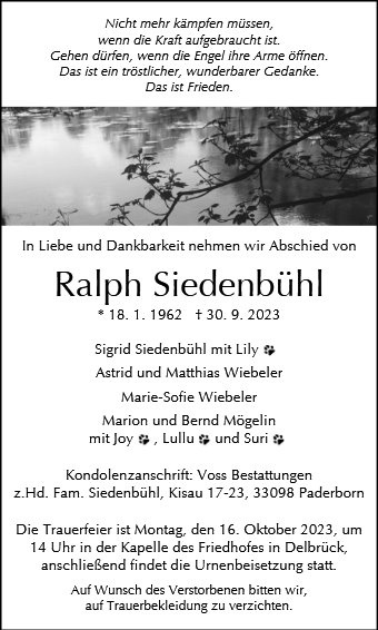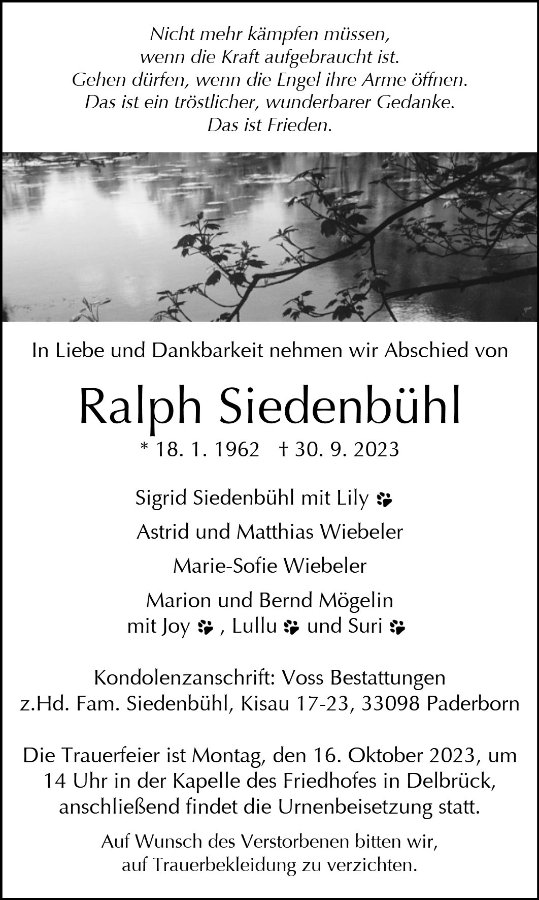 völlig überraschend habe ich die Nachricht von Ralphs Tod erfahren. Du kannst Dir vorstellen, wie traurig mich das gemacht hat. Ich habe Ralph als lieben Menschen kennengelernt. Er war immer freundlich und positiv eingestellt. Ich weiß, wie sehr Du sein Mittelpunkt warst, aber auch umgekehrt.