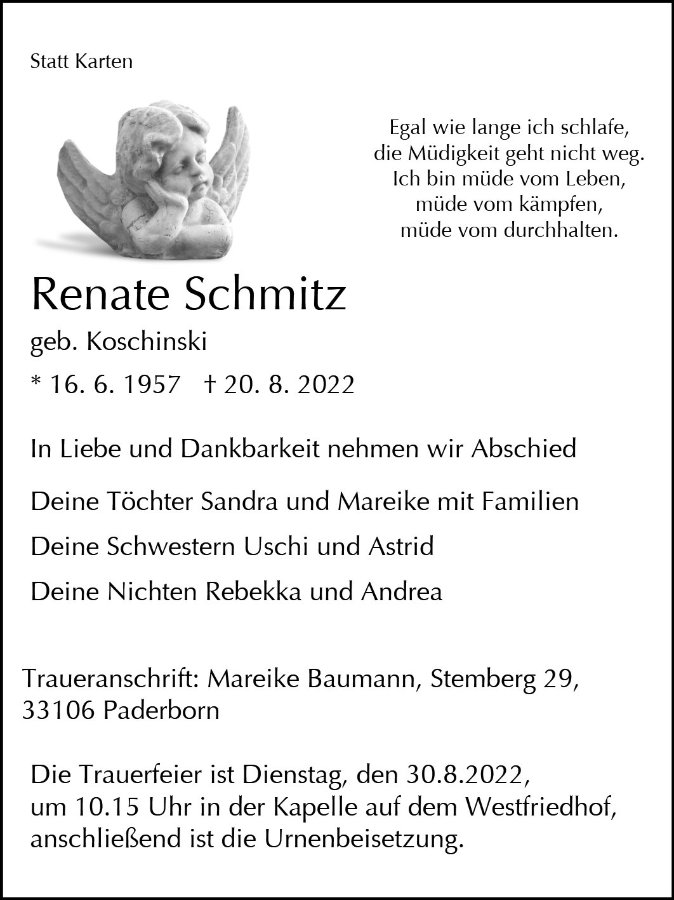 Ich kannte Renate von ihren Besuchen mit ihrer Schwester Uschi in der Filiale, in welcher ich arbeite.