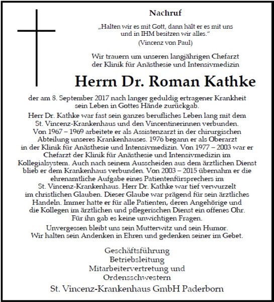 Dr. med. Roman Kathkegestorben am 8. September 2017