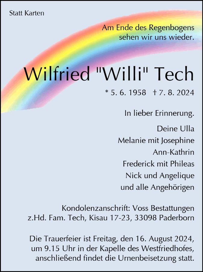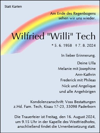 Wir kennen uns leider nicht, doch möchte ich der Familie mein herzliches Beileid zum Verlust von Wilfried aussprechen.