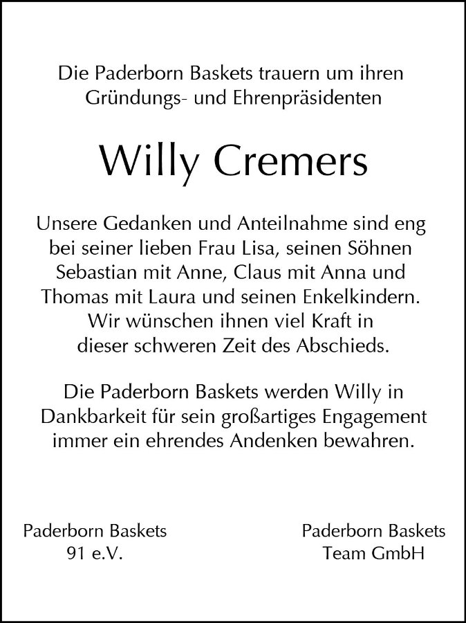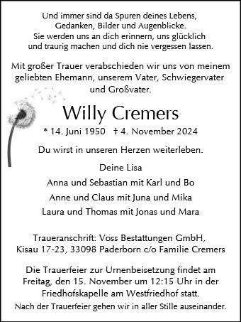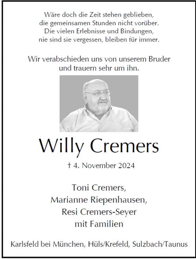 wir können es noch nicht begreifen. Wir verdanken Willy so viel, er war uns immer ein wichtiger Ratgeber. In unseren Herzen wird er weiterleben. Bei allem Schmerz überwiegt die Freude, ihn und Euch in unserem Leben zu haben.