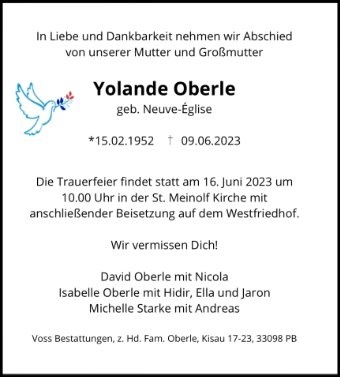 Viele Jahre war ich in Yolandes Französischkursus. Es war mehr als Wissensvermittlung, sie hat ihr Leben mit uns geteilt, besonders bei den Reisen. Da haben wir auch ihre Heimat kennengelernt. Sie wird mir sehr fehlen. Meine Anteilnahme ist bei Ihrer Familie